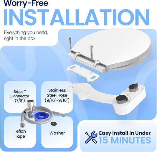 Non-Electric CLEAR REAR Bidet Attachment for Toilet - Self-Cleaning Dual Nozzle, Adjustable Pressure, White