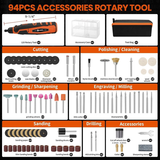 12V Cordless Rotary Tool Kit with 94 Accessories – 6-Speed, 30000RPM for Engraving, Sanding, Polishing & DIY Projects