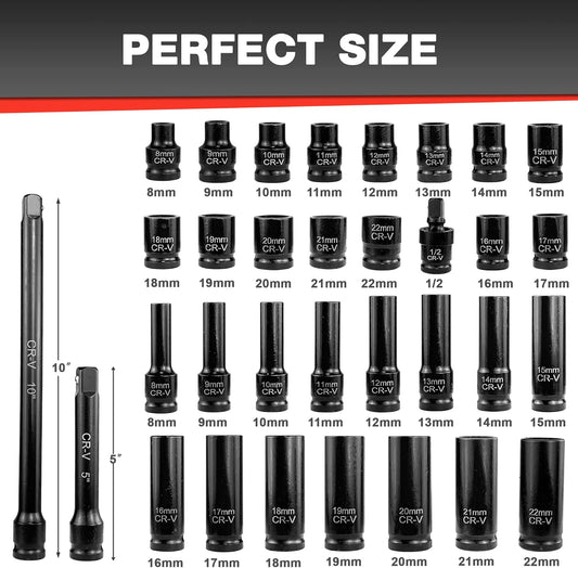 29-Piece Deep Impact Socket Set with Extensions | SAE & Metric Cr-V Steel