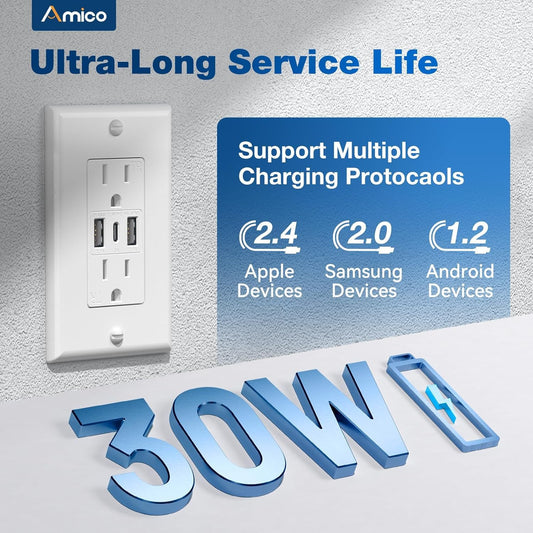 Amico 6-Pack USB Wall Outlets, 3-Port 30W with Type A & C, Tamper Resistant, ETL Listed