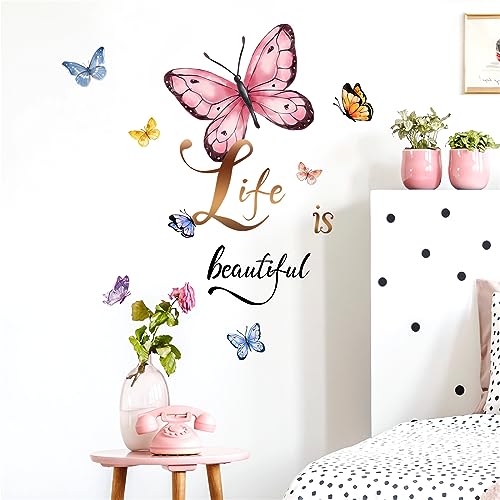 Colorful Butterflies Slogan Wall Stickers, sacinora DIY Art Wall Decals Life is Beautiful Removable Vinyl Peel and Stick for Living Room Bedroom Bathroom Nursery Playroom Decorations