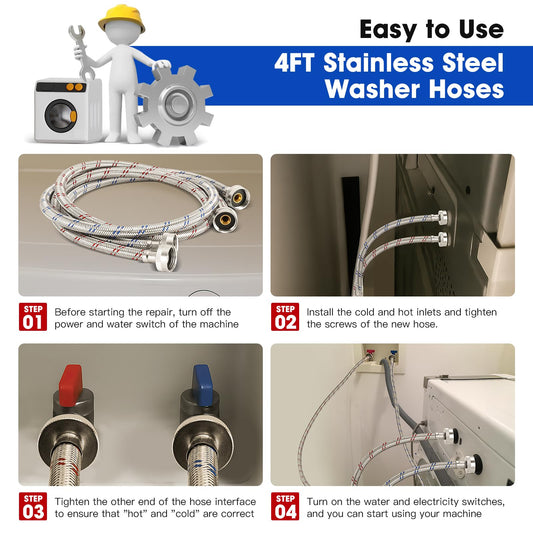 Gecyfit 4 FT Washing Machine Hoses, 2 Pack Premium Stainless Steel Washer Hose, Explosion-Proof Durable Hot & Cold Water Supply Lines, Perfect Fit Washer Connection Hoses for All Washing Machines