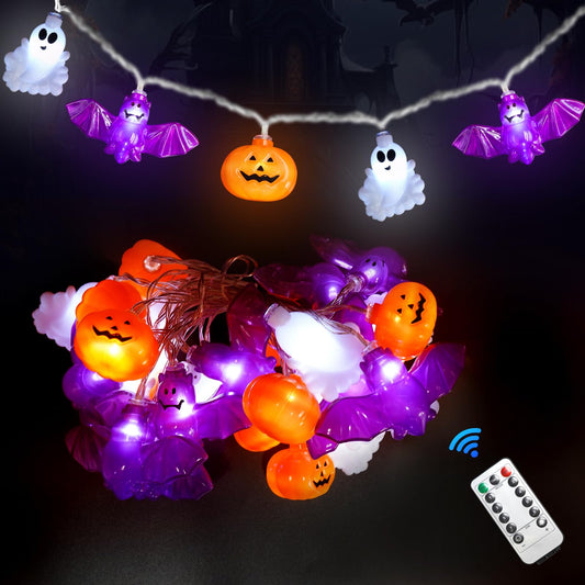Halloween String Lights Decorations, 16.4FT 30 LED 3D Pumpkin Bat Ghost Battery Operated Orange Purple String Lights, 8 Modes Timer Hanging Fairy Light for Indoor Outdoor Window Porch Home Party Decor