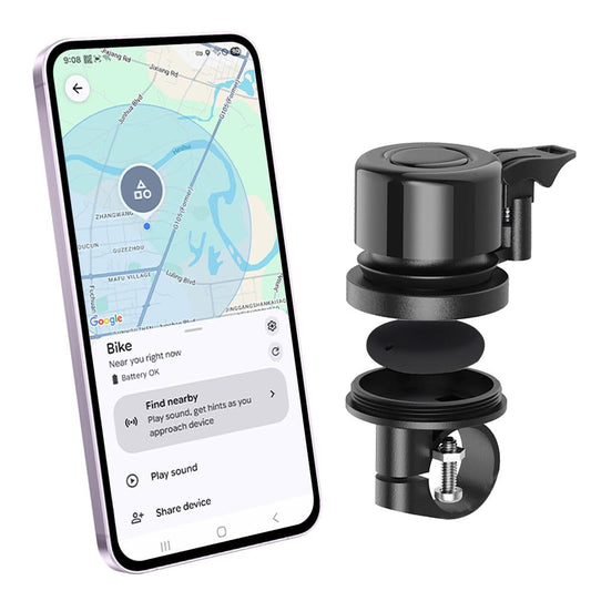 Bike Bell with Tracker Tag Work for Find Hub APP, Bike Mount for GPS Tracker Waterproof Classic Stainless Steel Holder, Anti-Theft,100dB, Fit 0.83''/22.0, 1''/25.4mm Handlebars (Android Only)
