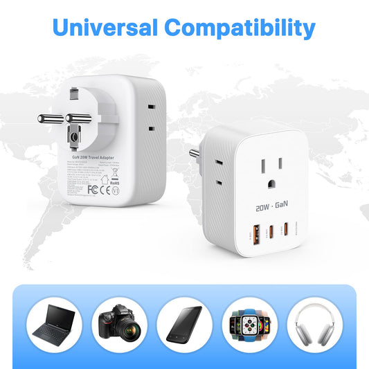 European Travel Plug Adapter, Thinkbee GaN 20W Type E/F Power Plug, with 3 AC Outlets, 2 USB C & 1 USB A Port, Travel Essentials for US to Most Europe French German Spain Greece Norway Iceland Korea