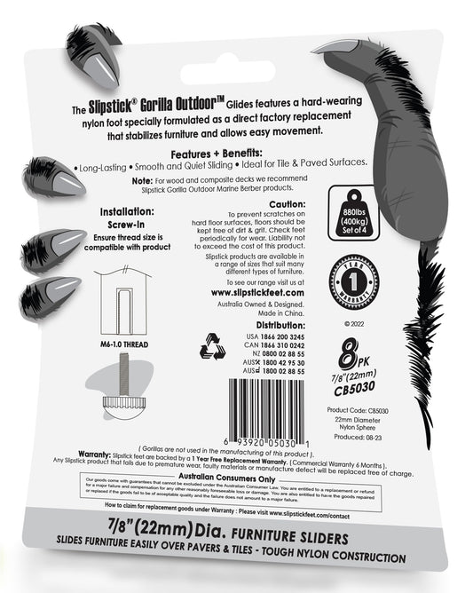 Slipstick Gorilla Outdoor Adjustable Furniture Levelers (8 Pack) Weatherproof Screw in Leg Glides for Chairs, Tables, and Outdoor Furniture Feet, 7/8 Inch Nylon Spherical Glide, M6 Thread