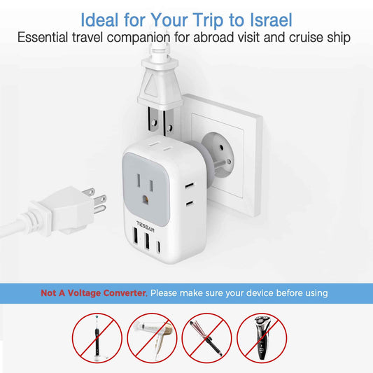 TESSAN Israel Power Adapter, US to Israel Plug Adapter with 4 American Outlets 3 USB Charger (1 USB C Port), Type H Travel Adaptor for USA to Jerusalem