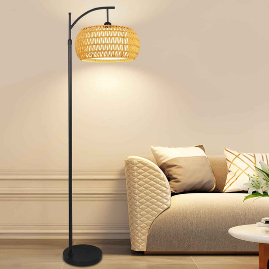 Arc Floor Lamps for Living Room Rattan Boho Floor Lamp with Remote Control,Dimmable LED Floor Lamp Wicker Lamp Shades Black Standing Lamp with 3 Color Temperature Tall Floor Lamps For Bedroom Corner