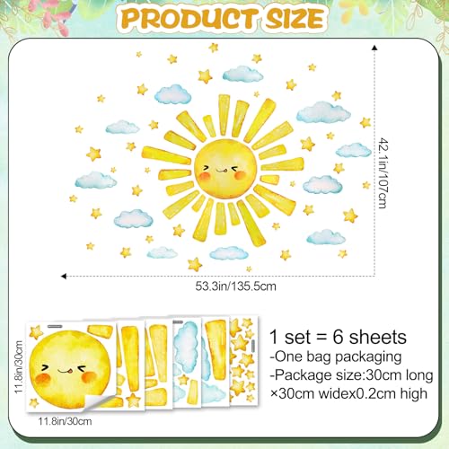 Cartoon Sun and Stars Wall Decals - 6 Pack 12x12 Inch Watercolor Smile Sun Peel & Stick Wall Stickers with Clouds, DIY Removable Boho Wall Art for Kids Room, Nursery, Classroom Decor Decoration