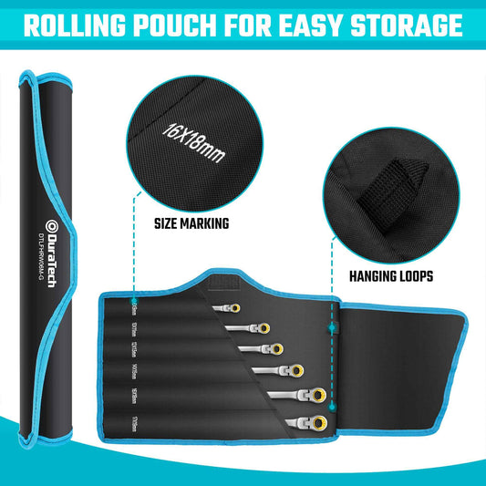DURATECH Extra Long Anti-Slip Flex-Head Ratcheting Wrench Set, Double Box End Wrench Set, 6-Piece, Metric 8-19 mm, CR-V Steel, with Pouch