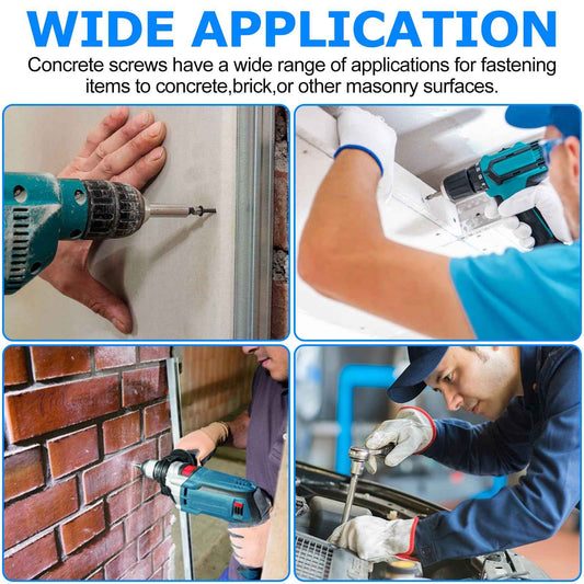 200PCS Concrete Screws Assortment Kit, 1/4 3/16 Masonry Screws with Drill Bit and Driver Bit, 4 Size Flat & Hex Head Cement Screws and Anchors, Diamond Point, Self Tapping Concrete Brick, Blue Coated