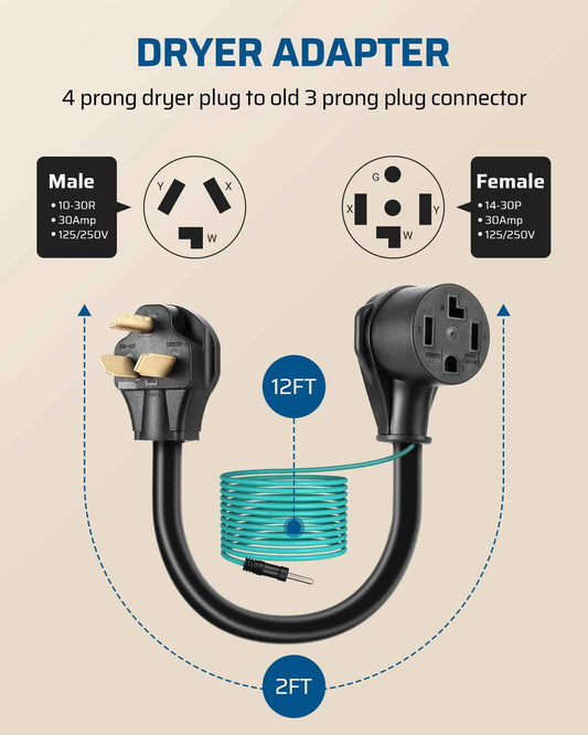 DEWENWILS 4 Prong to 3 Prong Dryer Plug Adapter, NEMA 10-30P Plug to 14-30R Receptacle, 4P Newer Dryer to 3P Older House,10AWG STW Dryer Connector Cord, 30 Amp/250V/7500W, 1.5 FT, UL Listed, Black