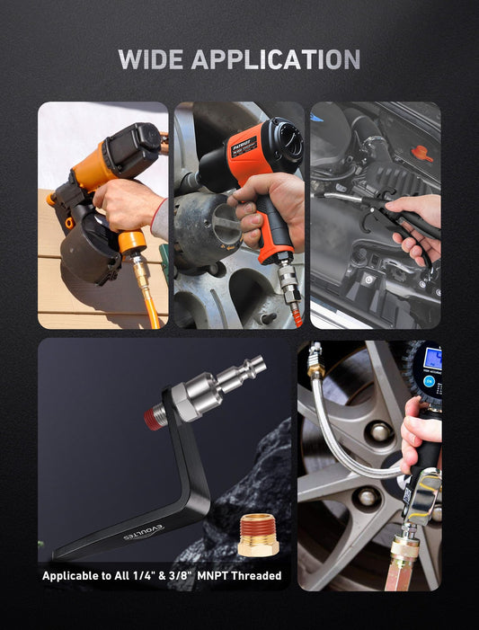 EVOULTES Pneumatic Tool Rafter Hook Hanger with 1/4 & 3/8 Inches Brass Air Fitting, 360° Swivel Lightweight Aluminum Air Tool Organizer Holder, L Shaped Hook for Air Nailer, Air Blow Gun