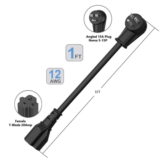 12AWG Right-Angle Plug Adapter 90-Degree 15Amp to 20Amp 1FT, 15 Amp Household Plug to 20 Amp T Blade Adapter Extender, Nema 5-15P to 5-15R/5-20R, 5-15P to 6-15R/6-20R, Angled 15A to 20A Extension cord