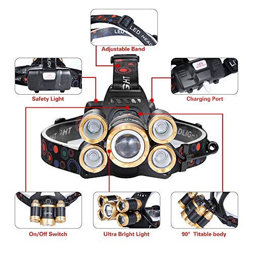 Headlamp Rechargeable,1200 Lumen Ultra Bright 5 LED Headlight Flashlight,Brightest USB Rechargeable Headlamps,Waterproof Zoomable Head Lamp 4 Modes Light for Outdoors Camping Hunting Hiking Hard Hat