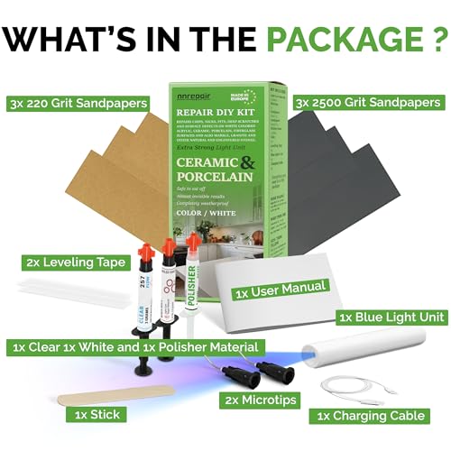 Porcelain Repair Kit (Clear/Transparent & White) - Fix Your Defects on Tiles, Sinks, Bathtubs & More I Suitable for Most Repairs I Upgraded Light Unit