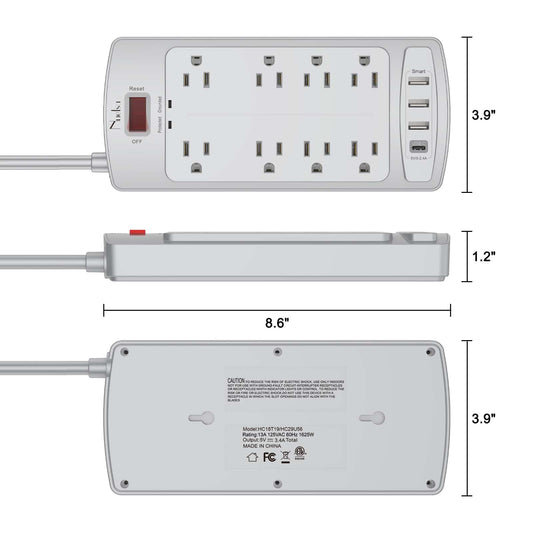 Surge Protector Power Strip - Nuetsa Flat Plug Extension Cord with 8 Outlets and 4 USB Ports, 6 Feet Power Cord (1625W/13A), 2700 Joules, ETL Listed, Grey
