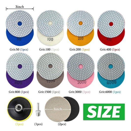 3 Inch Diamond Polishing Pads with M14 Backer Pad, 12PCS Wet/Dry Granite Stone Polish Pad Kit for Drill, Grinder, Polisher, 50-6000 Grit Diamond Sanding Pad for Concrete Marble Rock