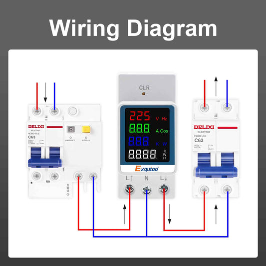 Exqutoo Multi-Function Energy Meter Color Digital Energy Meter - Measurement of AC Volts, Amps, Hertz, Watts, PF and Kilowatt-Hours - GT2P-E, AC 80~270V, 0~100A, 0~25KW, 50/60Hz, Rail-Mounted Meter