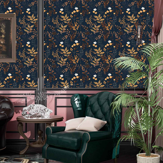 XRUIBZI Dark Blue Floral Wallpaper Peel and Stick Wallpaper Leaf Wallpapers Gold Leaf Contact Paper for Cabinets Waterproof Self Adhesive Wall Paper for Kitchen Countertop Wall 17.5" x 118"