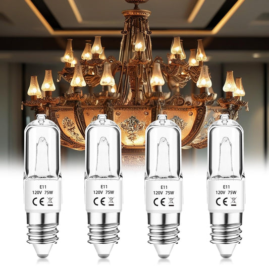 Jaenmsa JDE11 120V 75W Halogen Bulbs,T4 JD E11 Mini Can 75W Tungsten Halogen Candelabra Bulb Dimmable,Warm White 2800K Replacement E11 LED Light Bulb for Chandeliers/Ceiling Fan/Cabinet Light,4 Pack