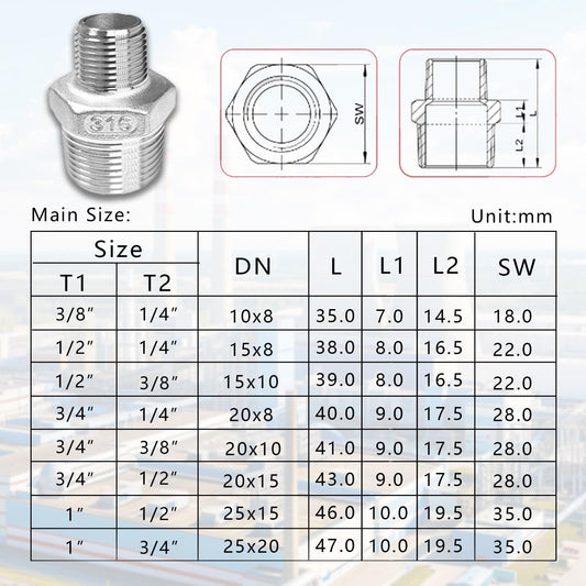 Dnkoua 2-Pack 316 Stainless Steel Reducing Hex Nipple, 1/2" NPT Male x 1/4" NPT Male Pipe Fitting Adapter - Corrosion Resistant Reducer Connector for Plumbing, Hydraulic Systems (1/2" to 1/4")
