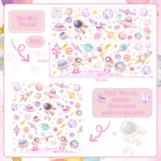 Kreatwow 2pcs Outer Space Wall Stickers for Girl Outer Space Wall Decorations Pink Astronaut Planet Decal Solar System Birthday Decoration Galaxy Rocket Cling Sticker Galaxy Astronaut Party Home Decor