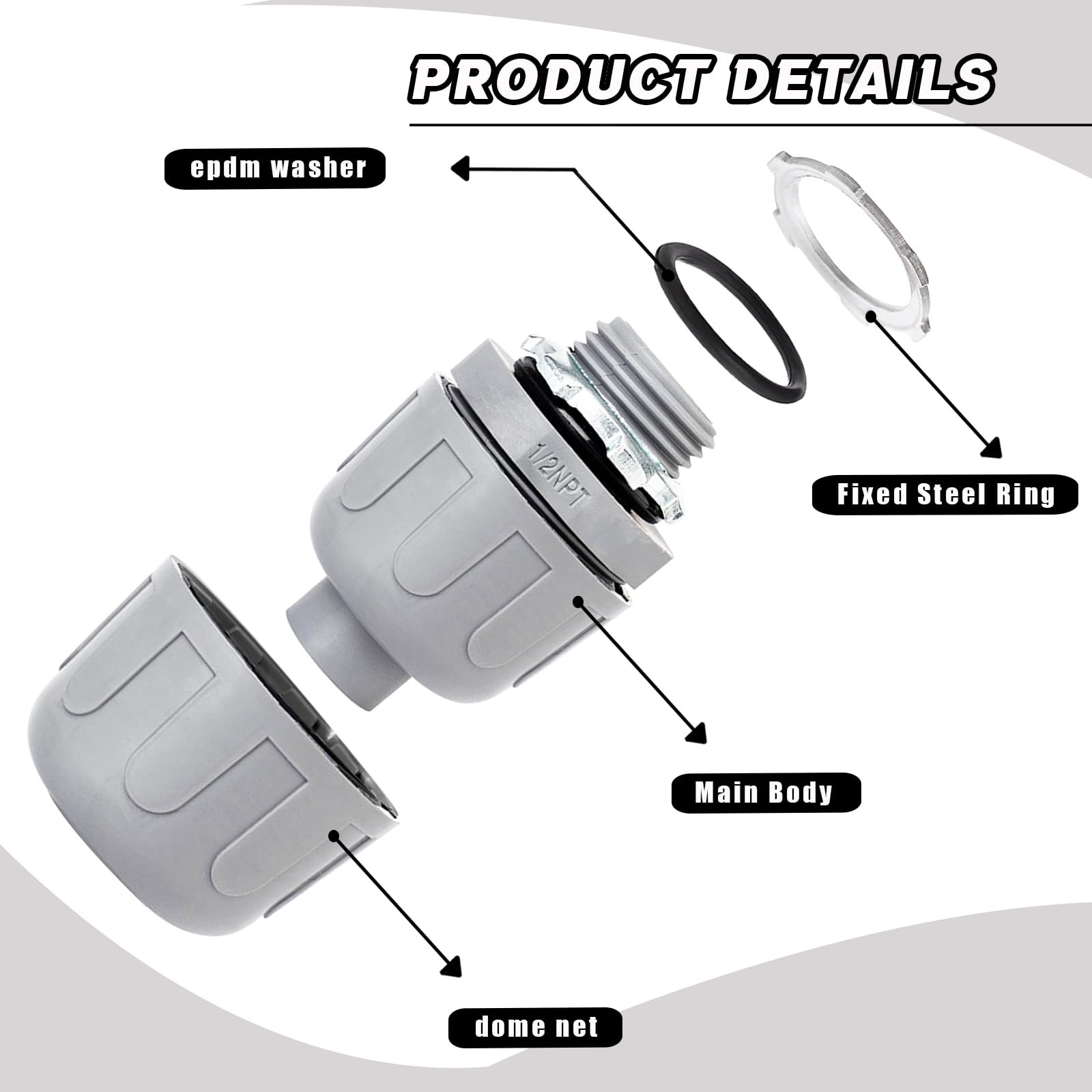 - Material: Our liquid tight connectors is made of high quality PVC and iron lock plate, not easy to break or deform, sturdy and safe enough for long term use