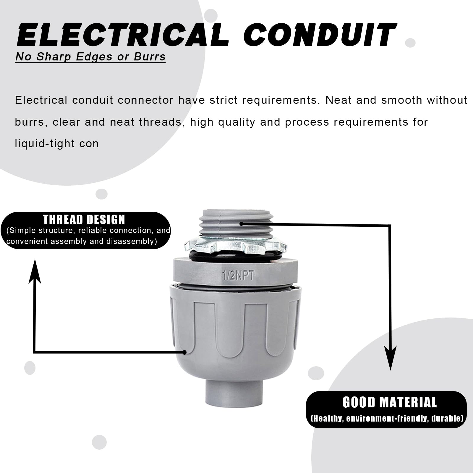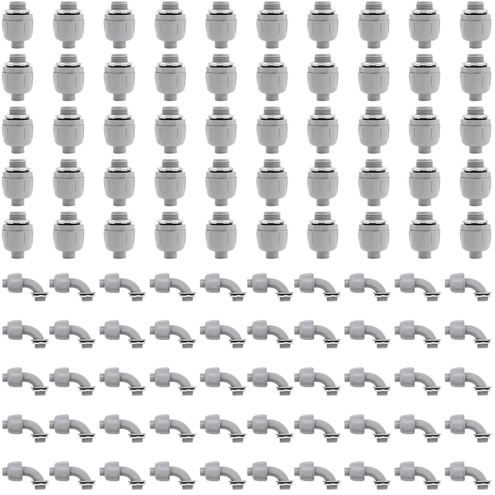 - Liquid Tight Connector: Our 1/2 Inch straight and bend conduit fitting set. Quantity: 100 Pieces, contains 50 pcs straight connectors and 50 pcs 90-degree conduit connector fittings