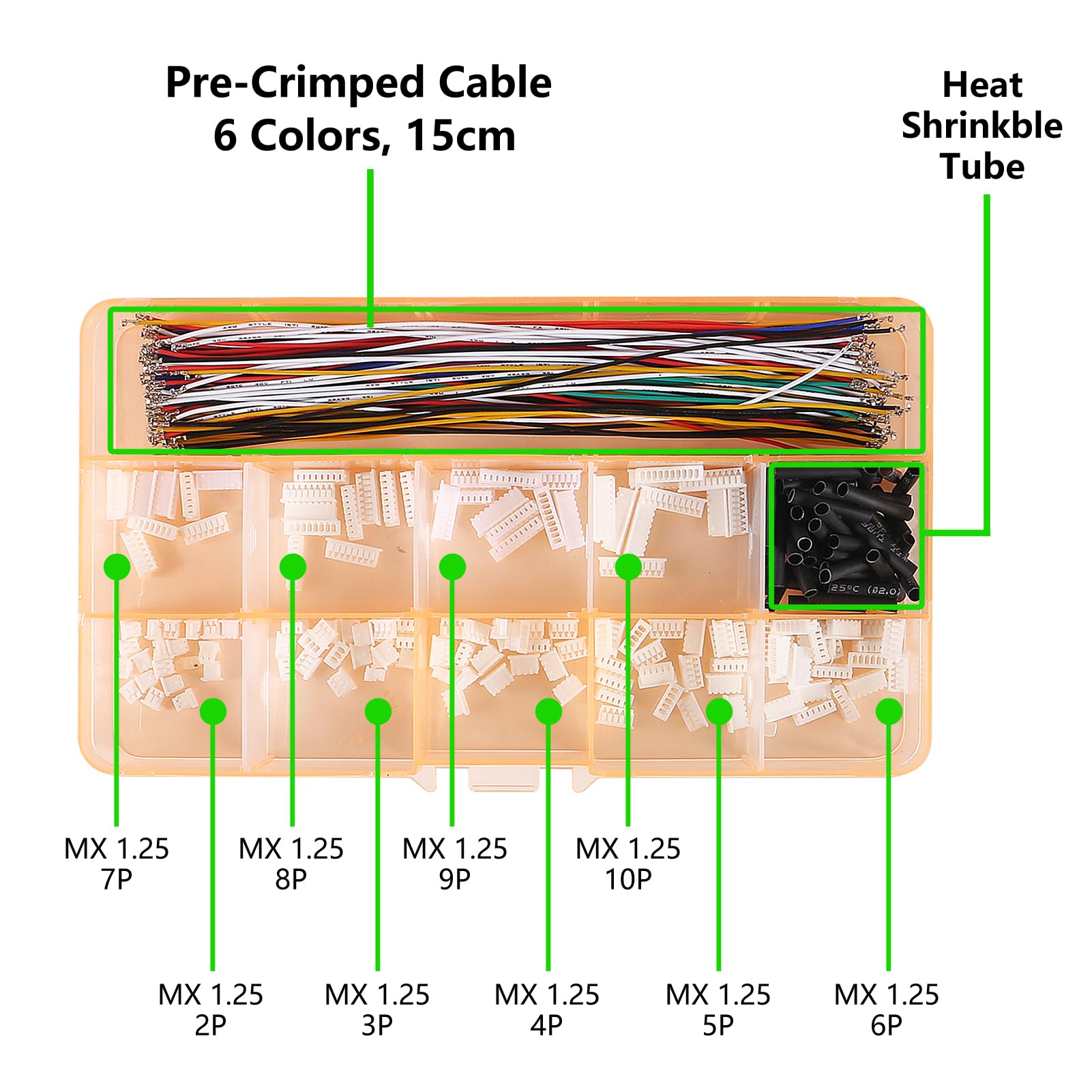 - 1.25mm pitch connectors kit includes MX 1.25mm 2/3/4/5/6/7/8/10 pin connector, pre-crimped wire, heat shrinkable tube