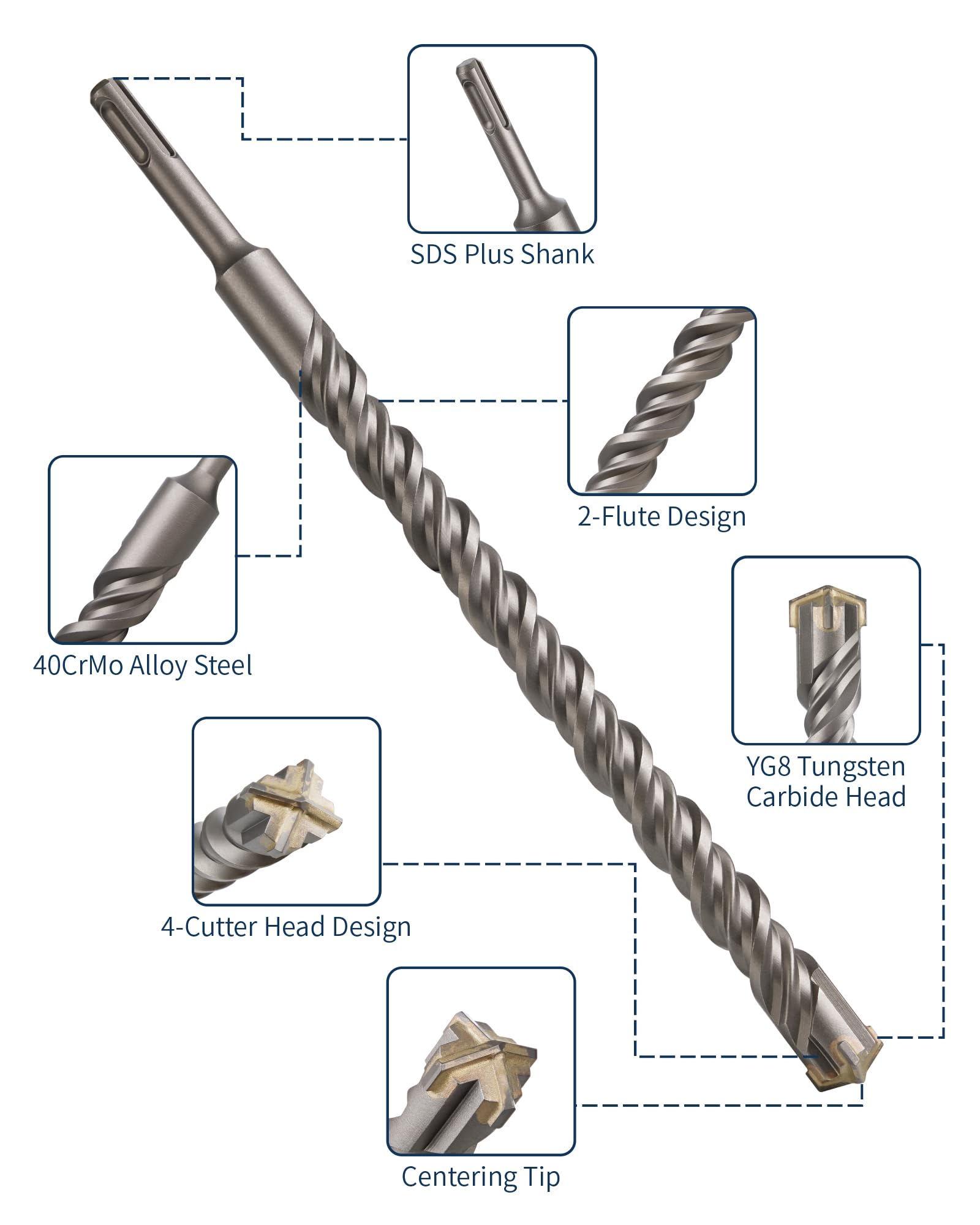 - 4-Cutter Carbide Tipped Bit Head: SDS plus concrete drill bits feature a four-cutter tipped head design that provides four cutting edges to help prevent the brick drill bit from getting stuck for enhanced durability. Each tile drill bit has a solid carbide tip to ensure maximum transfer of impact energy for better performance in concrete and masonry. Centering tip is ideal for drilling anchored holes for improved drilling accuracy