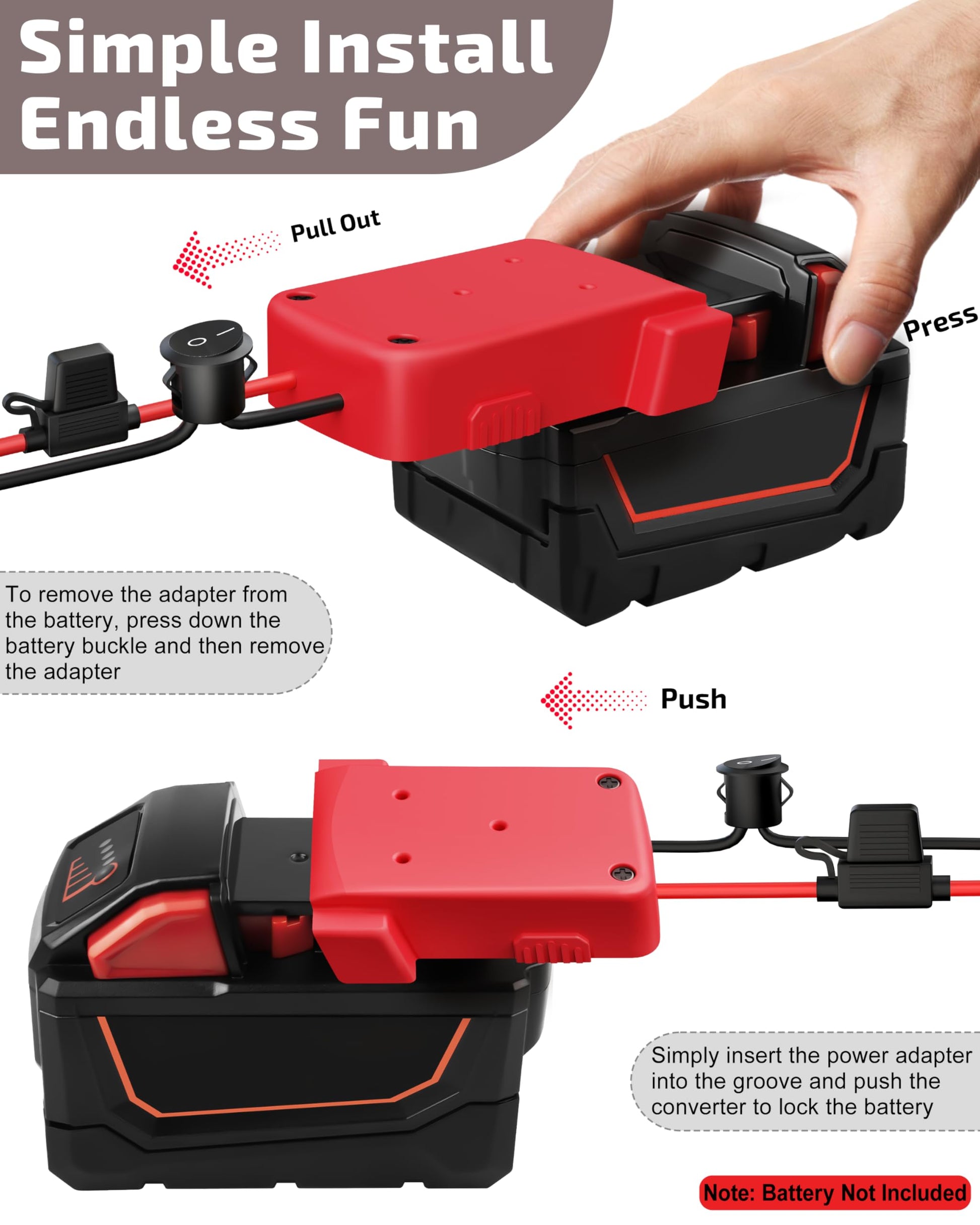 - Convenient & Easy Installation: Designed with user convenience in mind, Crivon power converter makes installation a breeze. Simply slide adapter into battery groove until securely locked, and you're ready to power your devices. To remove, press battery buckle and detach adapter. The included wire connectors enable quick connections, alleviating any hassle during setup. Three fixing screw holes on M18 adapter allow easy mounting on wall, machine, or DIY items, providing stability and convenience