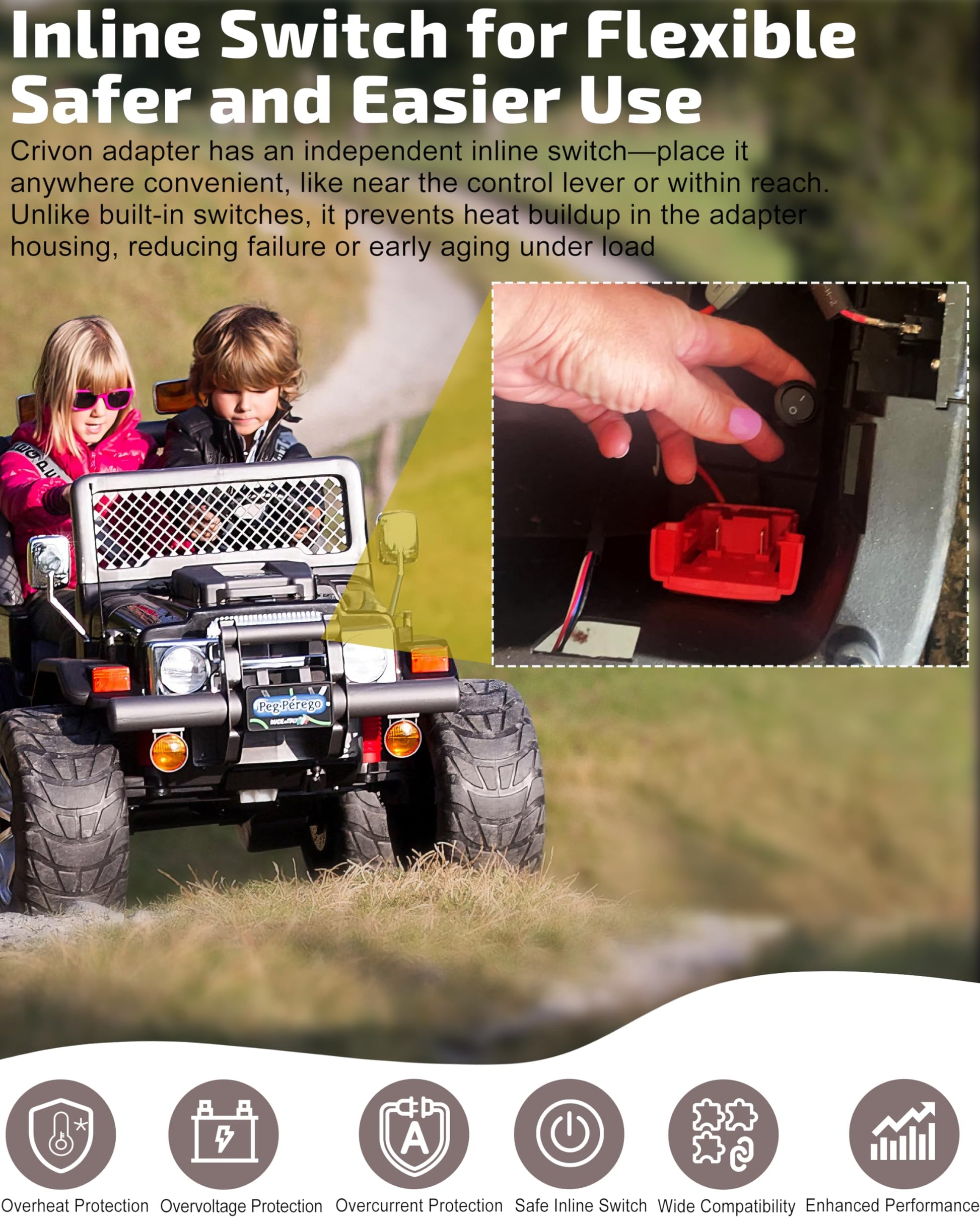 - Inline Switch for Flexible, Safer & Easier Use: Crivon battery adapter features an independent inline switch for flexible wiring & easier operation—Place the switch anywhere convenient, like near the control lever or within easy reach. Unlike built-in switches, this inline switch prevents heat buildup in the adapter housing, reducing the risk of switch failure or early aging under heavy loads. Plus, Maintenance is simple—if the switch fails, just replace the inline unit—no need to open the shell
