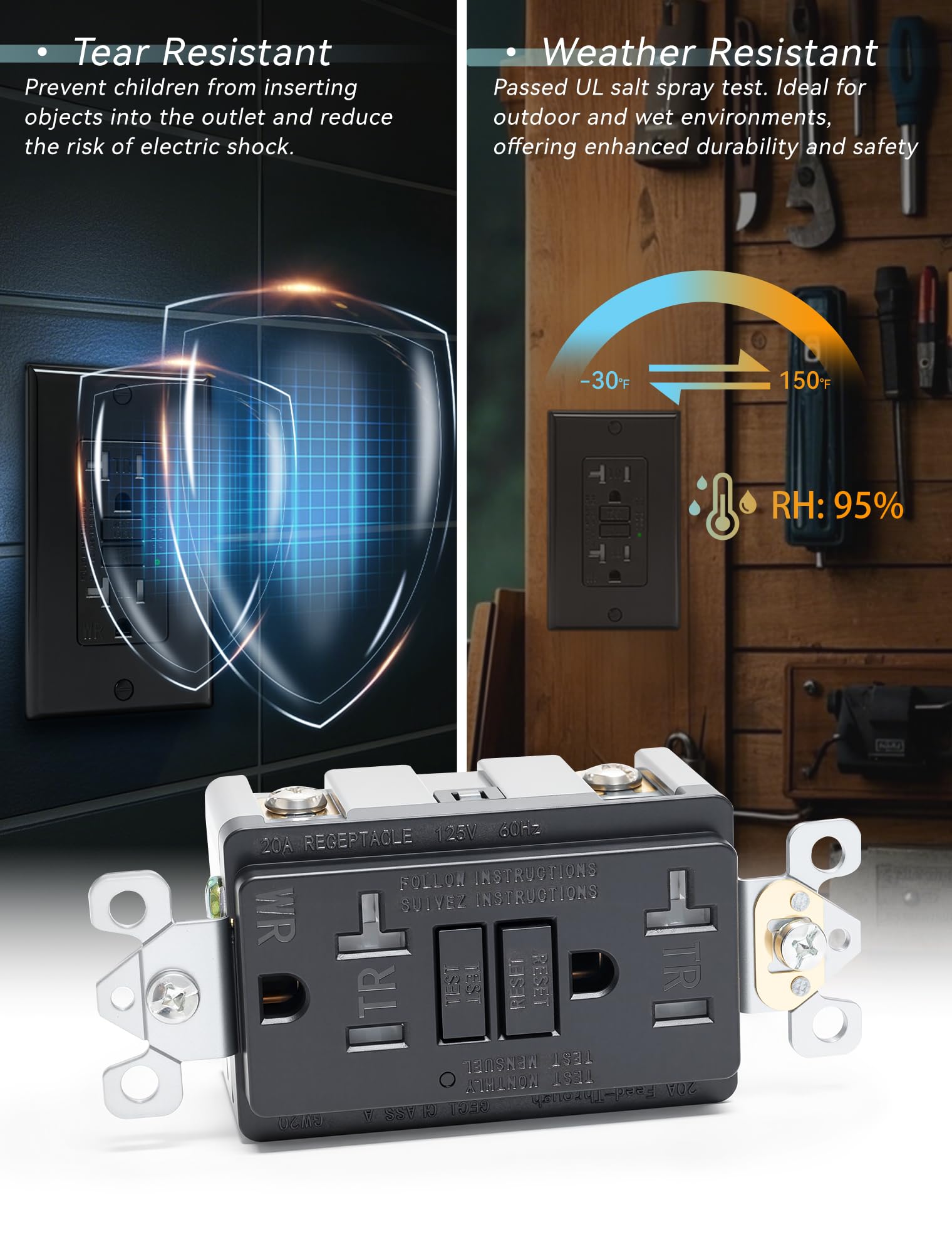 - Tamper-Resistant and Weather-Resistant Design.Designed with TR & WR Ratings, this outlet protects children from electrical hazards and performs reliably in harsh environments. It has passed the UL Salt Spray Test, ensuring corrosion resistance for outdoor, bathroom, and kitchen use. With an operating range of -30°F to 150°F and up to 95% humidity, it’s built for durability in any condition.