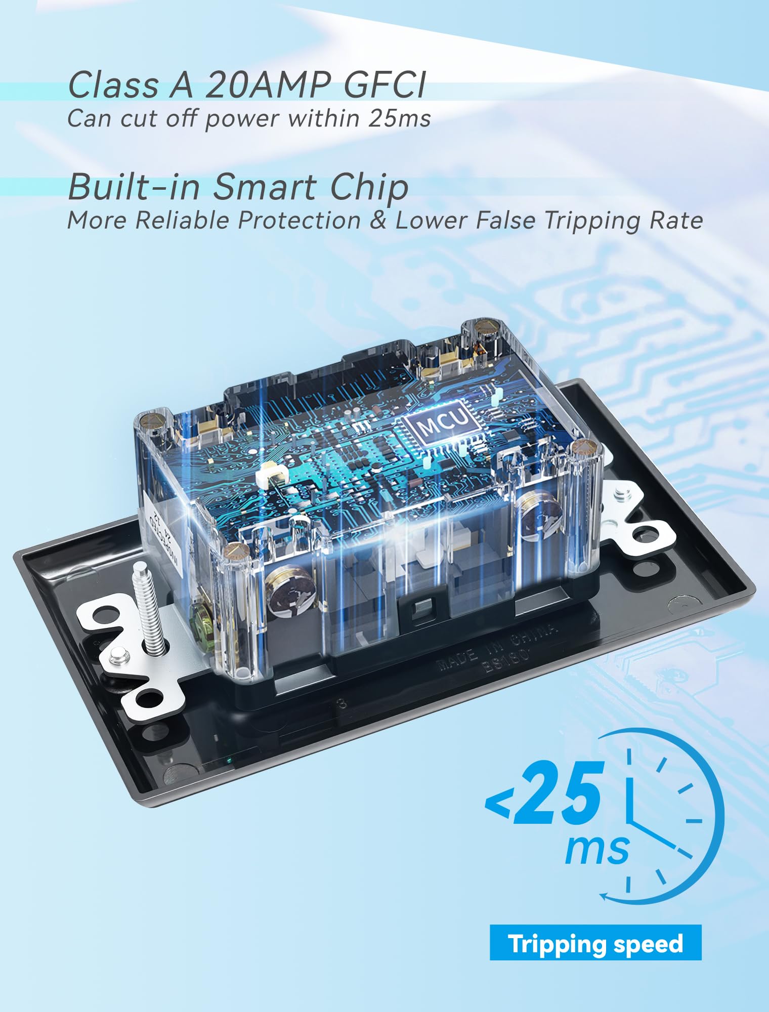 - Advanced Chip for Enhanced Performance.Equipped with an Advanced Chip, this GFCI outlet delivers superior stability, fewer false trips, and faster response times. It detects ground faults at a threshold of less than 6mA and cuts power in under 25ms, providing reliable and efficient protection for your home or workplace.
