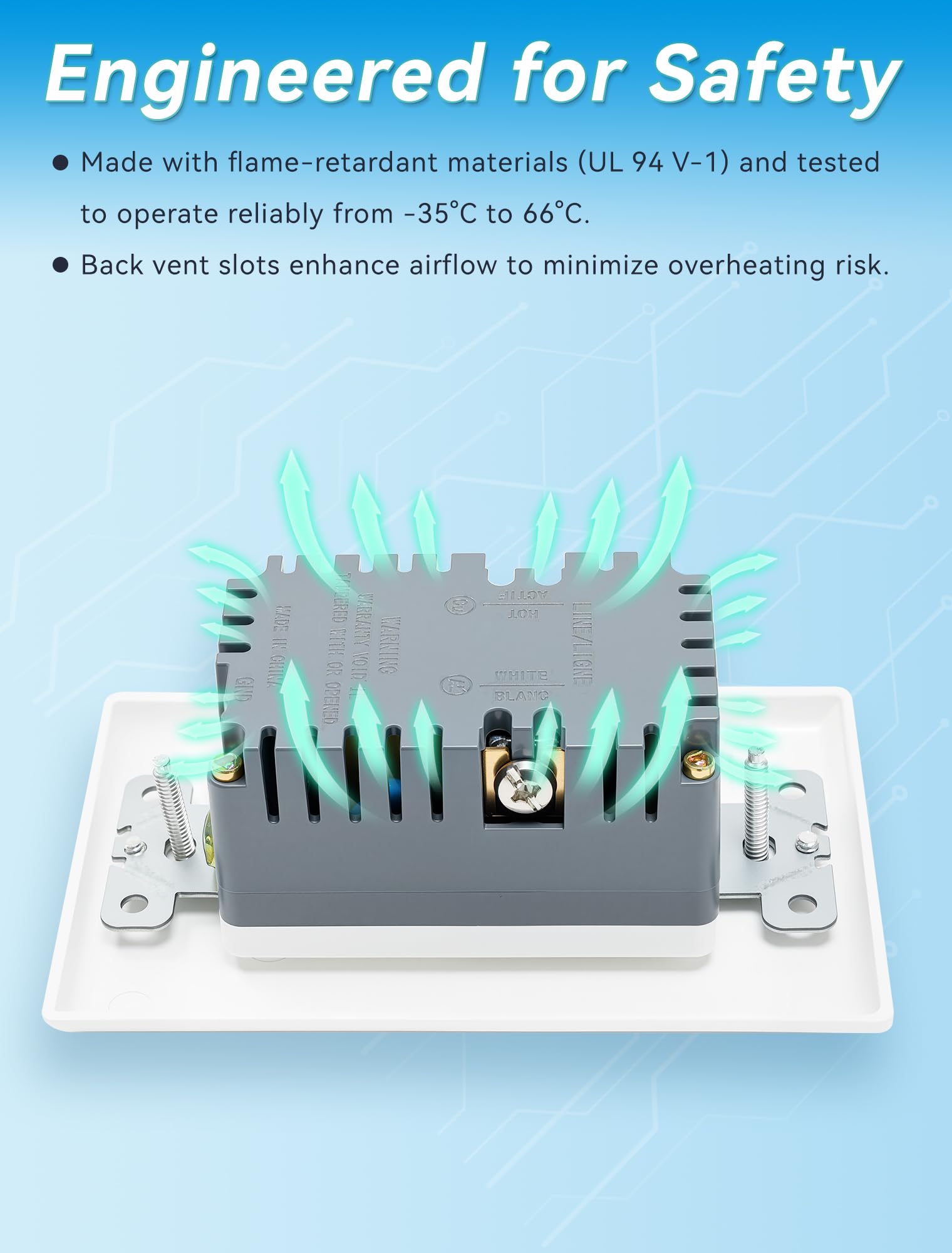 - UL/cUL certified and compliant with UL498 and CSA C22.2 No.42 standards, this NEMA 5-20R, 20A 125V receptacle, compatible with 15A plugs, delivers reliable safety and performance for residential, commercial, and public spaces such as kitchens, offices, and waiting areas.