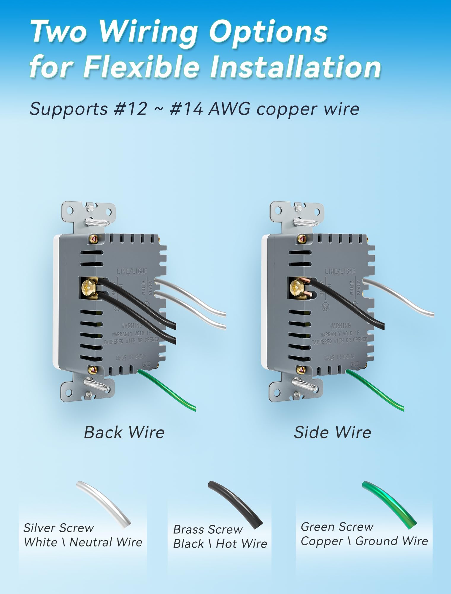 - Supports side and back wiring compatible with #12 to #14 AWG copper wires; this 2-pole, 3-wire grounded receptacle ensures safe, stable installation across residential, commercial, and public spaces.