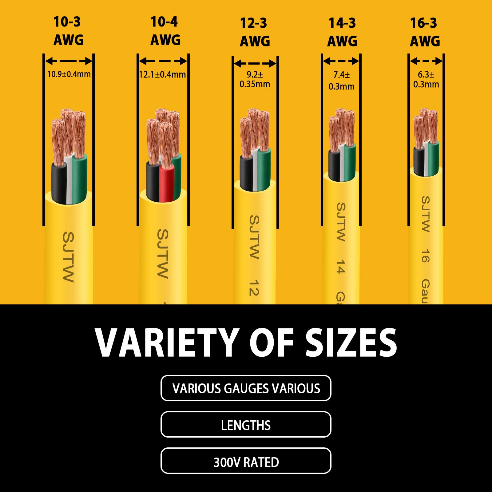 - You Will Receive: a 10.9mm diameter SJTW cable cord wire, 10AWG - 3 Conductor , 50 ft in length, made from stranded pure copper conductor material. Friendly Reminder: No extra grounding wire. Not 3+1 type wire. Please confirm the Size and Style is what your need before ordering. Should any issues arise, reach out to us for prompt assistance. We're here to help you resolve any challenges you encounter.