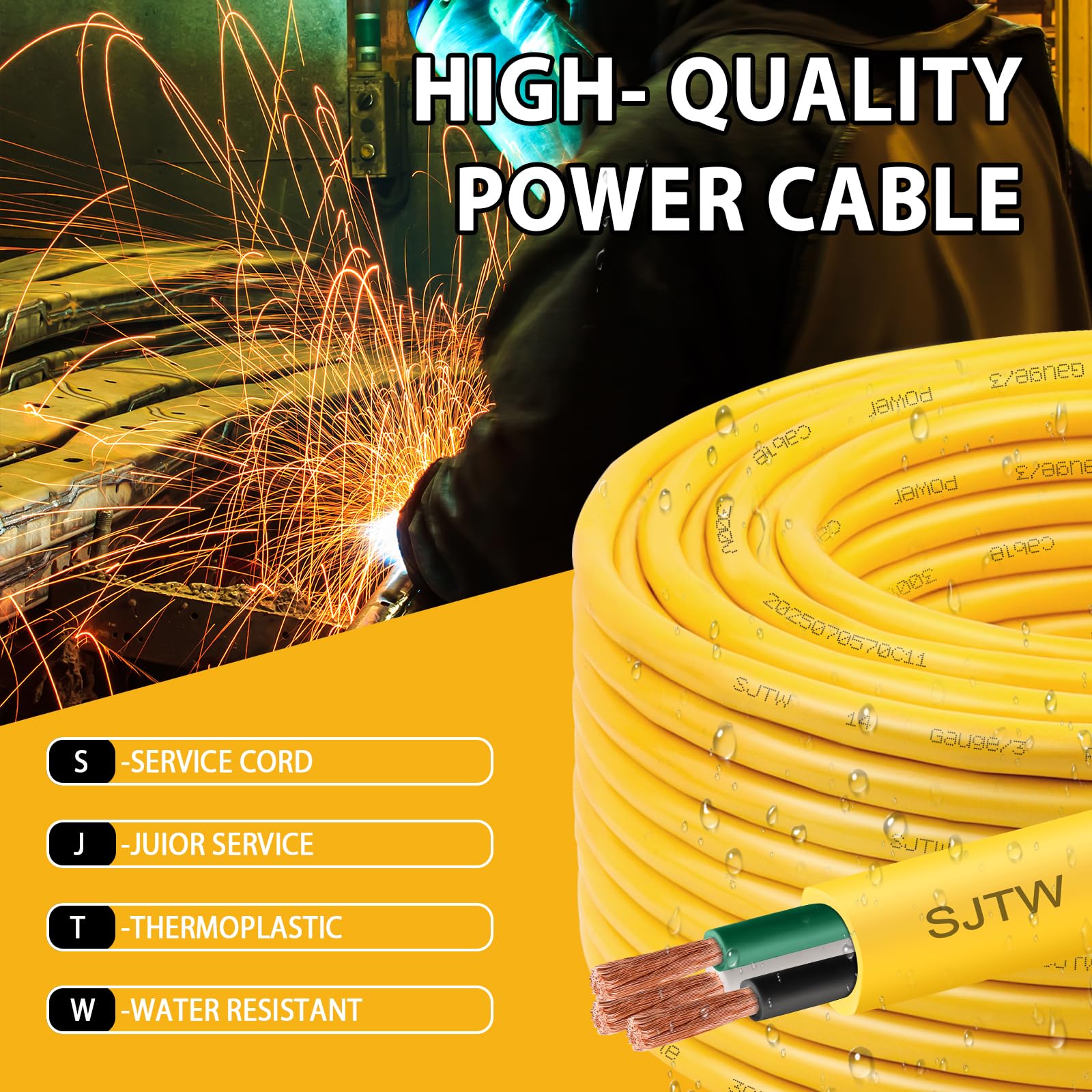 - Rugged Durability for Outdoor Conditions: Our Heavy Duty 10 AWG 300V SJTW (Service, Thermoplastic, and Water Resistant) cable (50 FT - 3 Conductor) is the first choice for industrial, commercial, and outdoor uses. With its insulated design and Anti-ultraviolet PVC jacket, ensuring reliability in even the harsh environments (-40℃ to 105℃).
