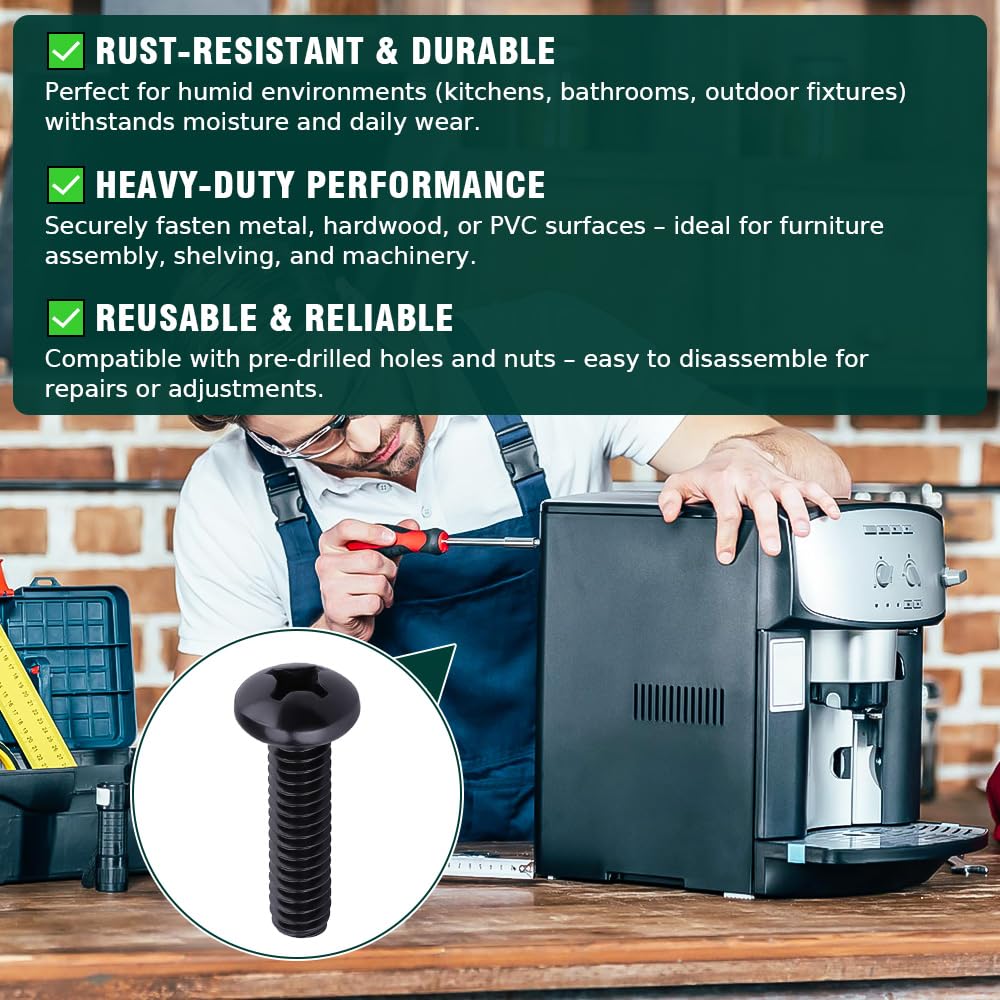 Details: #10-32 x 1" Pan Head Machine Screws Black, Phillips Drive, 304 Stainless Steel 18-8, Black Oxide Coated Finish, Corrosion Resistant Round Head Machine Screws, Full Thread, Coarse Thread, 50 PCS