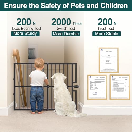 - ¡¼Safety Child Gate¡½Our safety gate have been laboratory tested to ensure safety.The pressure installation method has passed the 200N thrust test and 200N load-bearing test to ensure the stability of the gates. It is more stable and stronger than traditional easy install gate. 2000 times opening and closing test ensures the durability of the lock. The safety of children and pets is our top priority