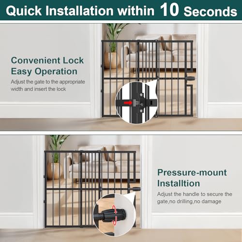 - ¡¼Installs in 10 Seconds¡½Simply adjust the baby gate to the appropriate width, insert the lock, and finally tighten the pressure nut handle to successfully install it. The pressure installation is easy to operate and can be completed in 10 seconds. No tools or drilling are required, which is easier to operate than traditional baby gates