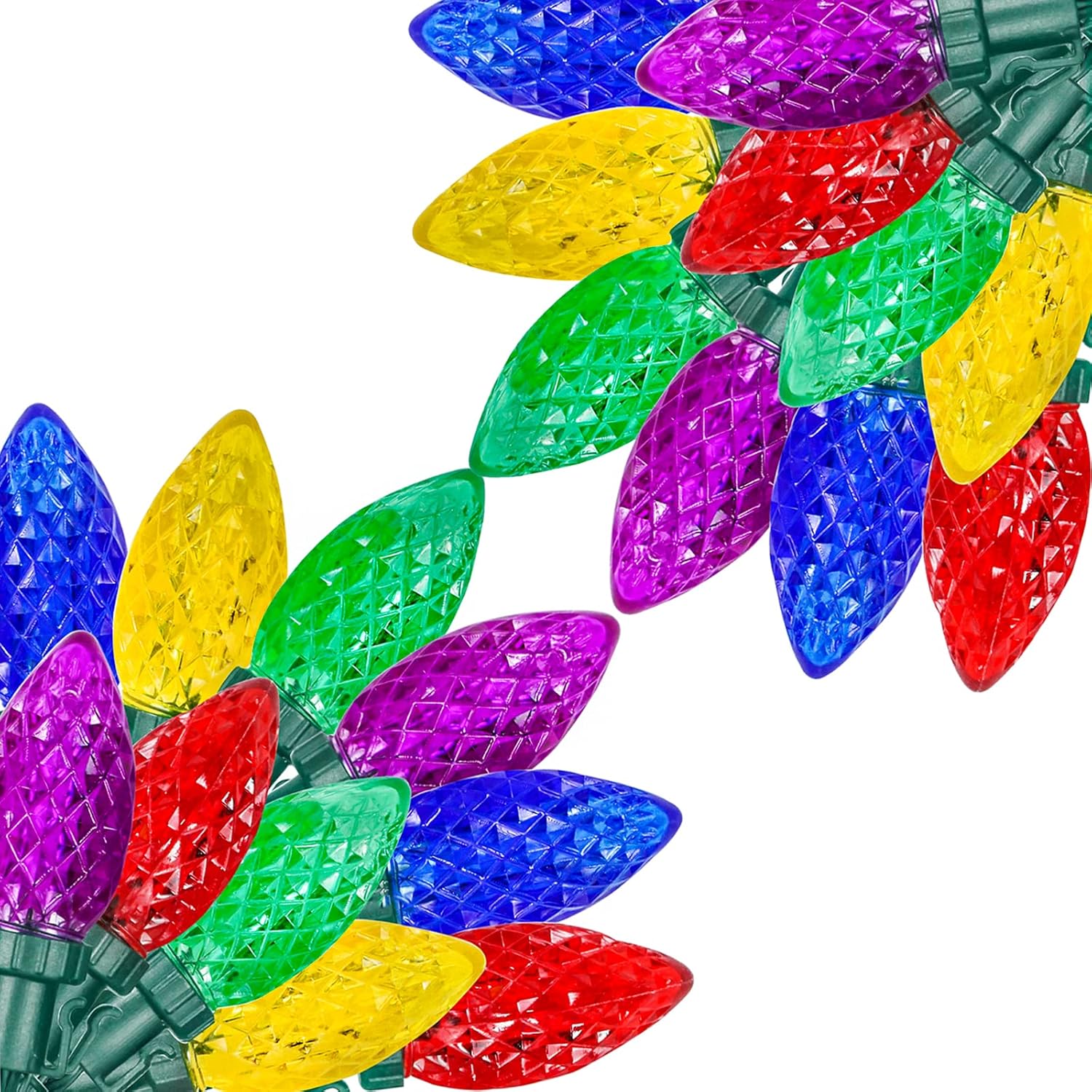 - 2 Pack C9 Halloween Lights: These Halloween string lights feature strawberry-shaped C9 bulbs in three classic Halloween colors—orange, purple, and green—perfect for creating a vibrant and spooky atmosphere at your Halloween party. Each pack includes 2 strings of lights. Each string measures 10 ft of leading wire plus 33 ft of lighting with 50 LED bulbs—totaling 100 LED bulbs and 66 ft in length for the 2-pack