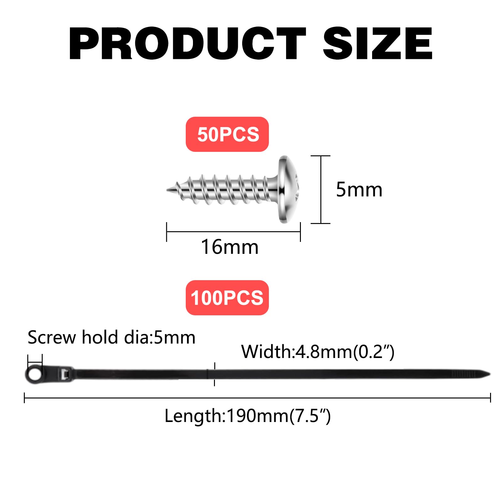 Details: Package Includes: 1. 100PCS black nylon cable ties (0.36cm wide, 20cm long) with holes type 2. 50PCS M4*3cm screws