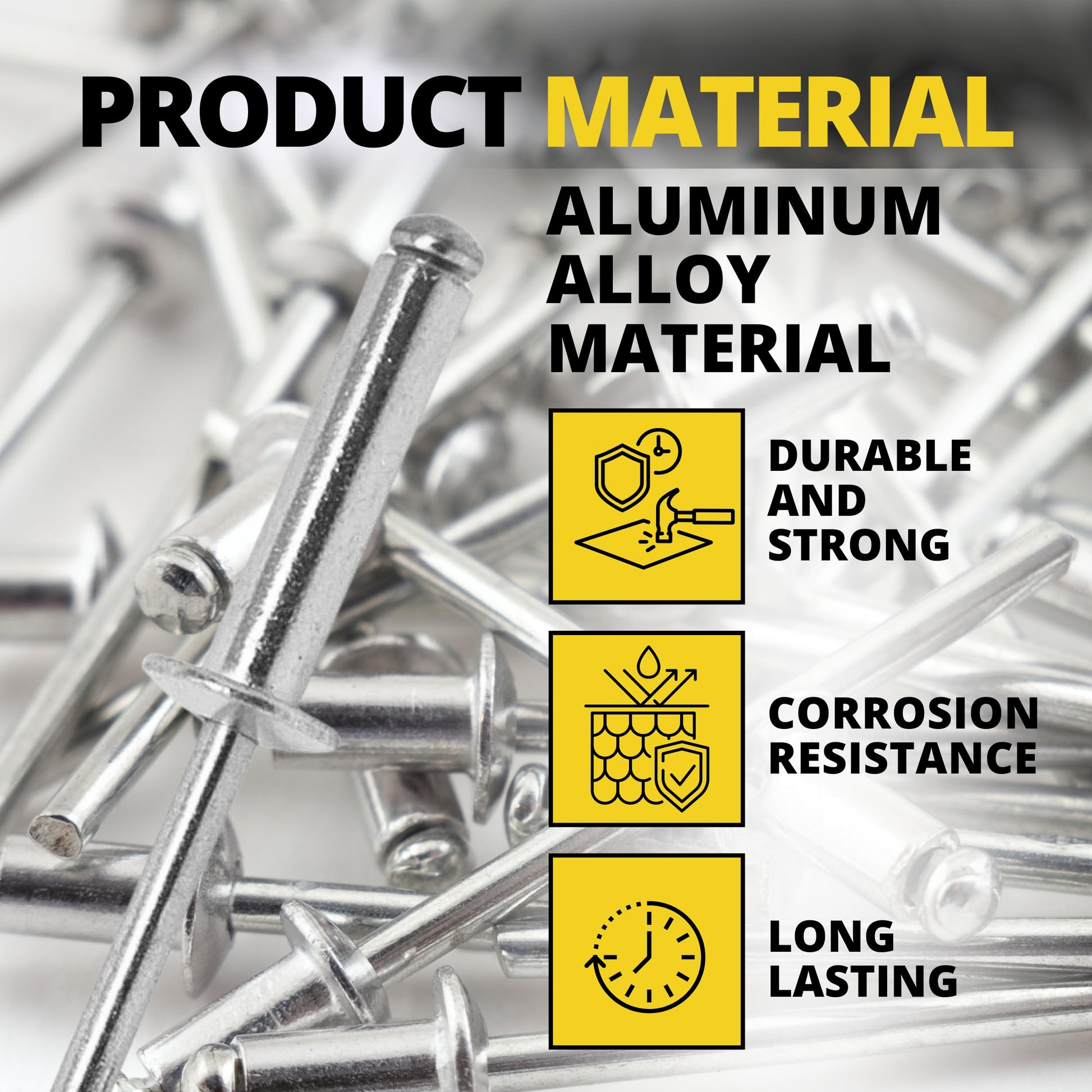 - Each aluminum rivit has a diameter of 3/16", with a grip length of 1/2". The thick shaft provides a secure hold when tightened, and the wider surface area prevents pull-through, making these 3/16 pop rivets, small rivets for metal ideal for holding thinner materials where breakout is common