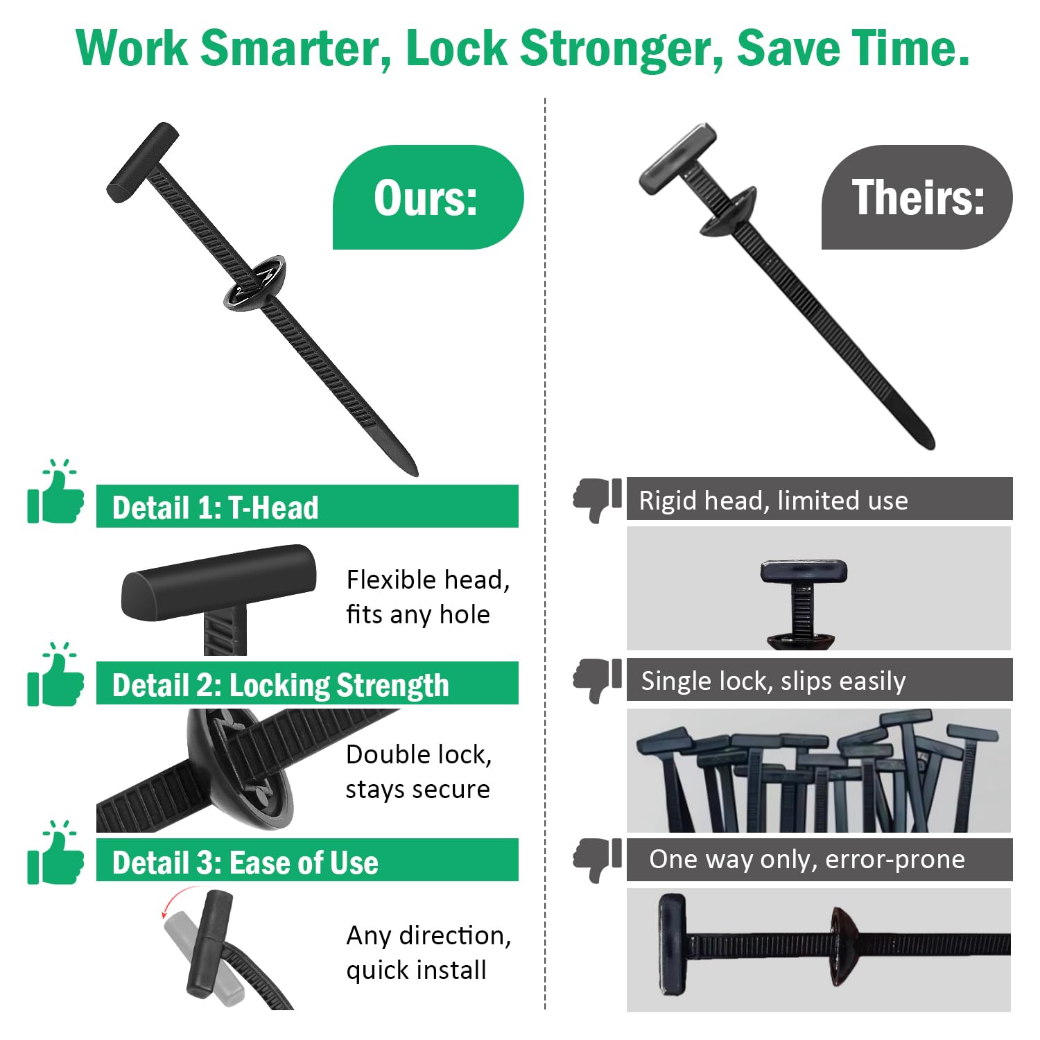 - 【Strong & Reliable Grip】These zip ties heavy duty feature a pre locking, anti slip mechanism that resists loosening under vibration, oil, or moisture. Unlike many generic cable ties or zip tie clips, our nylon universal cable tie buckle stays secure on car parts, appliances, and outdoor tools.
