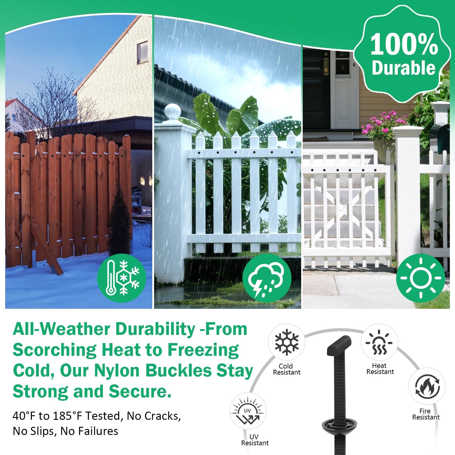 - 【UV & Weather Resistant】Made from premium nylon 66 with carbon black additives, these black zip ties and heavy duty zip ties withstand sunlight, rain, and temperature swings. Durable zipties and universal cable tie buckle fasteners deliver long term performance for outdoor gear, garden tools, bikes, and other equipment exposed to the elements.
