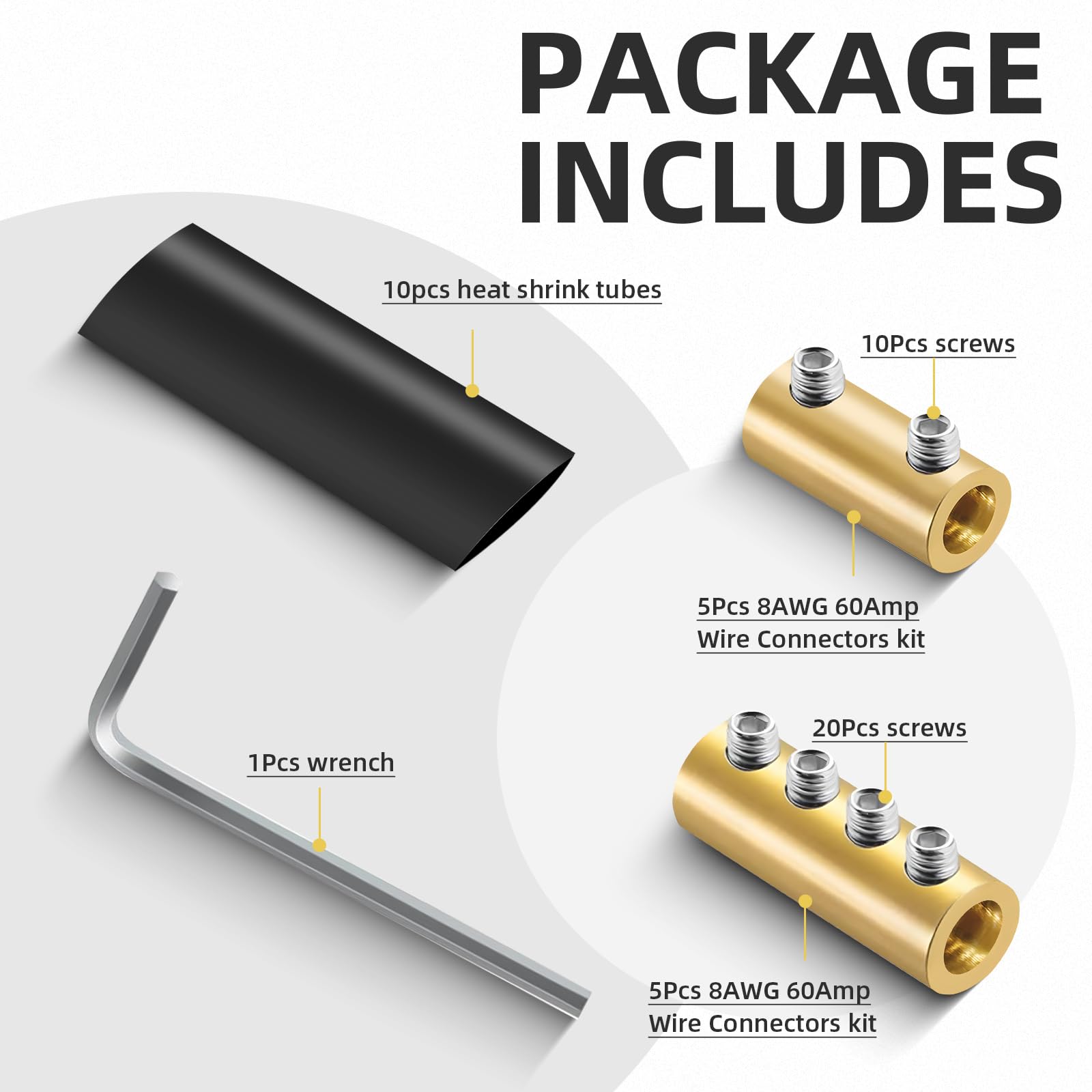 - PREMIUM MATERIAL: These 10pcs 6,8,10 awg gauge 80amp wire connector nut kits (5* 2Nuts; 5*4Nuts; 30*Screws; 10*Shrink tube; 1*Wrench for installation) are made of high-quality brass material, ensuring high conductivity and excellent current carrying capacity, resistant to oxidation and corrosion for long-lasting performance.