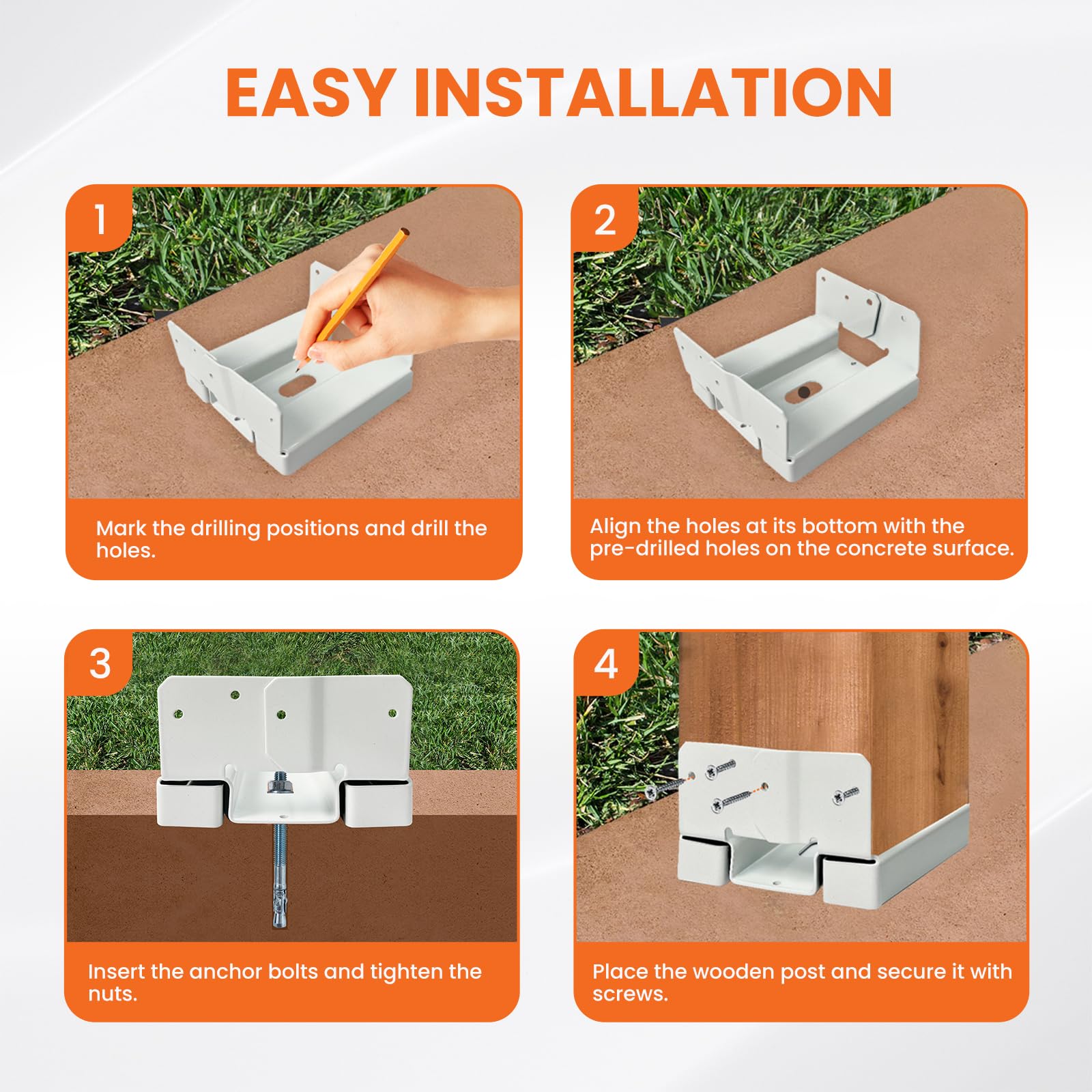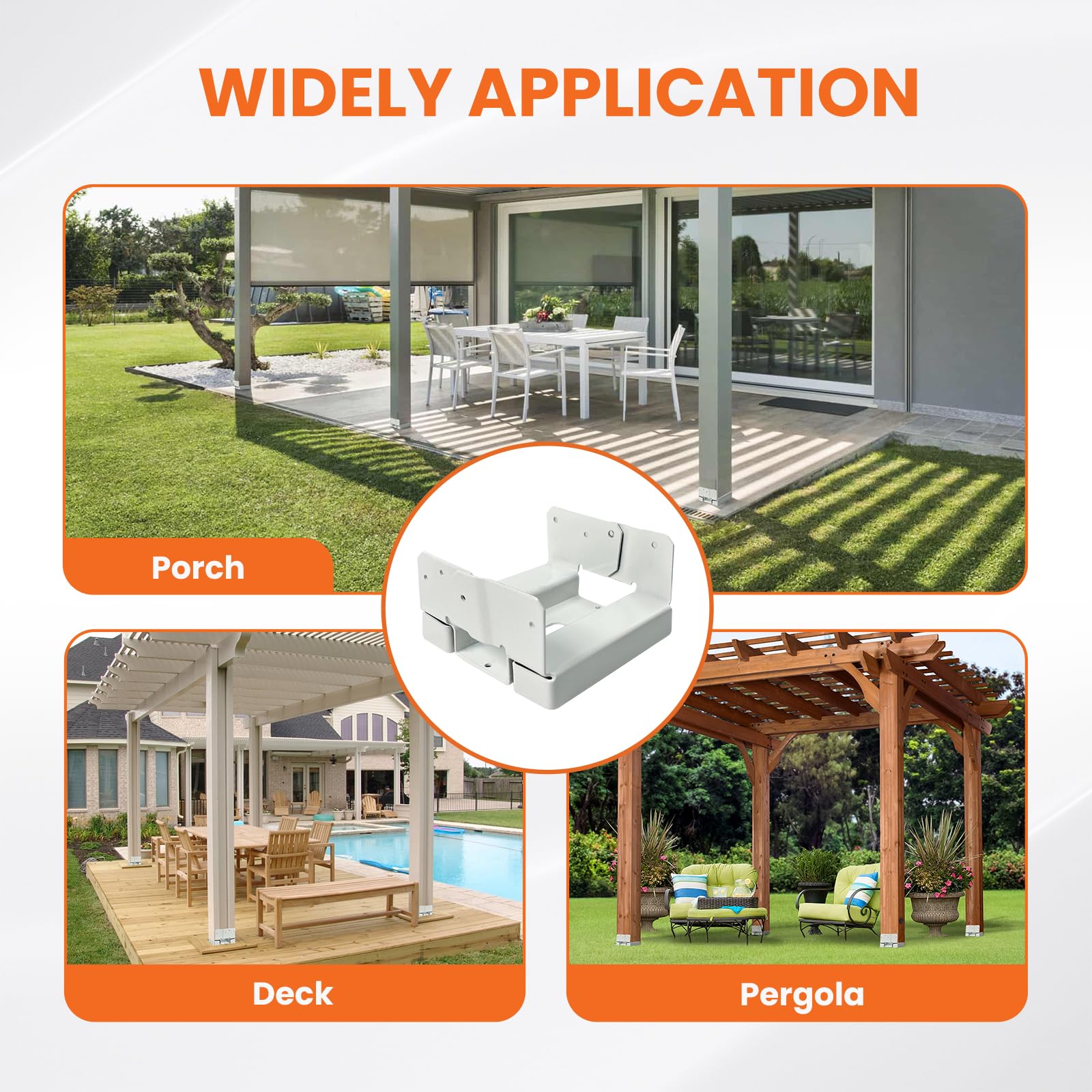 - 𝐂𝐨𝐫𝐫𝐨𝐬𝐢𝐨𝐧-𝐫𝐞𝐬𝐢𝐬𝐭𝐚𝐧𝐭 𝐄-𝐜𝐨𝐚𝐭𝐢𝐧𝐠: Each 6x6 post bracket is coated with pearl white e-coating and galvanization, providing superior corrosion resistance and rust prevention.This dual-layer protection ensures a long lifespan while significantly reducing maintenance and replacement frequency.