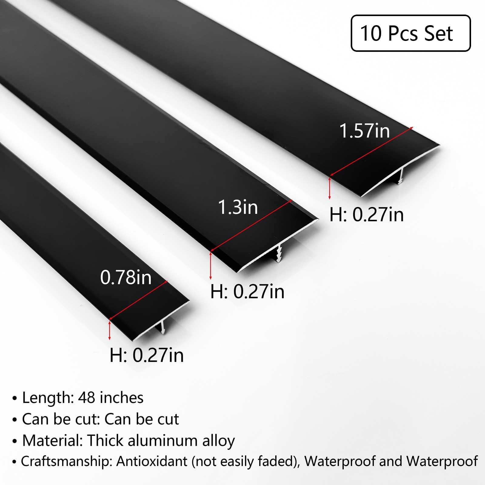 - Aluminum T-Molding Transition Strip – with waterproof wear-resistant matte black finish. Ideal for wood, tile, or laminate flooring gaps for seamless transitions between flooring types. (48in length, 0.78in width, 0.3in high).